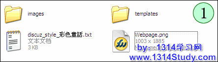 2.其中最主要的三个文件: images是图片文件夹,templates是模板文件的文件夹,discuz_style_彩色童话.txt是风格导入文件。