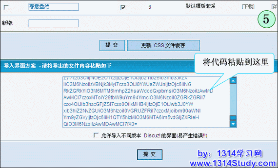 6.打开discuz_style_彩色童話.txt文件,复制里边的全部内容,来到论坛后台――论坛设置――界面风格,将代码粘贴到下边的文本框里边,然后提交,如图 5 所示: