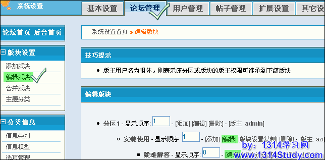 进入论坛后台“系统设置 -> 论坛管理 -> 版块设置 -> 编辑版块 -> 编辑”,如图 1 所示:
