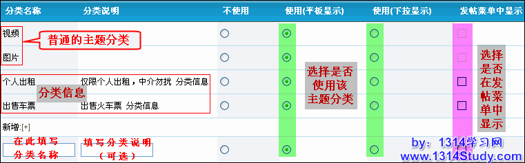 添加“分类名称”、“描述”及设置显示顺序后提交即可完成一个主题分类的添加,不过需要注意的是这里添加的主题分类默认是“不使用”状态,若要给某个版块使用该主题分类还得进入相应版块的编辑版块页面选择“使用”,方法同(1)中所述。