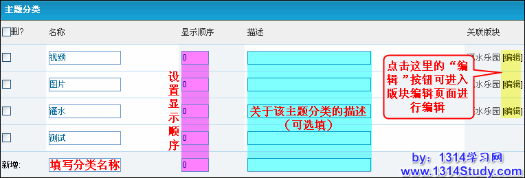 2)如果您将某些主题分类更名、删除或修改显示顺序,请编辑与此分类相关联的版块(不需做任何改动)后提交,主题分类才能被更新。