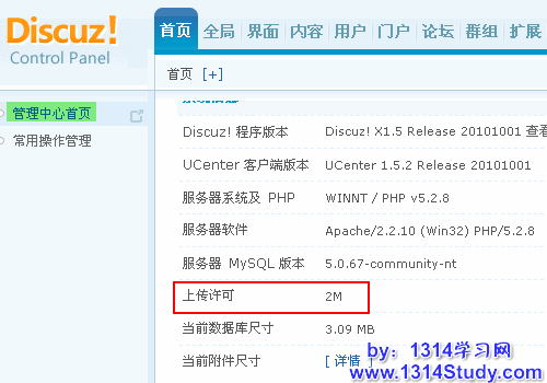 5)最大附件尺寸(单位K 1M=1024K):设置用户上传的每个附件的最大尺寸。需要 PHP 设置允许才有效,请参考管理中心首页同上。
