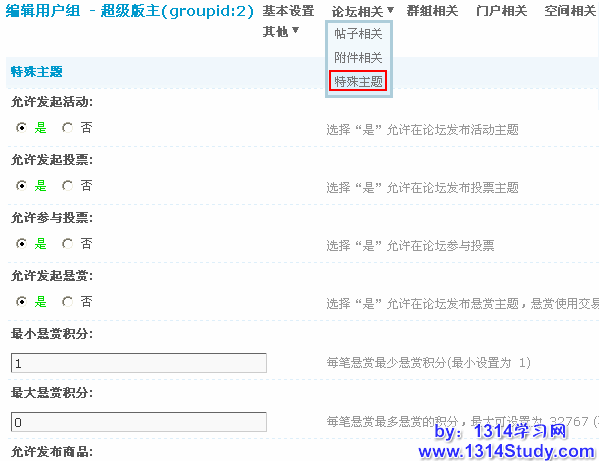 2)允许精华主题:设置是否允许精华管理范围内主题的级别。