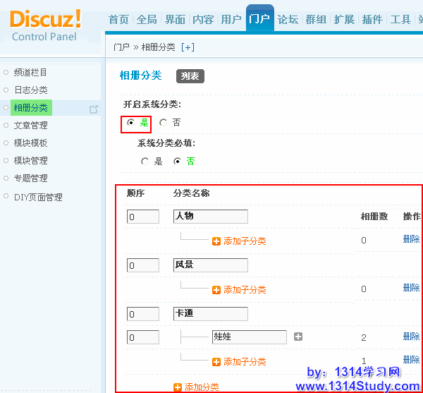 Discuz! X1.5 中可以设置用户在建立相册时的选择的系统相册分类,最多可以设置三级分类。在设置相册分类之前,必须要选择开启系统分类。有了系统相册分类后,会员上传图片的时候可以不用自己添加分类直接选择系统分类。选择一个系统分类,可以让会员的相册被更多的人浏览到,增强站点内会员之间的互动性。