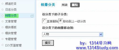 当对某一系统相册分类进行删除时,可以选择将此分类下的相册移动到其他相册分类中。如果该分类下存在子分类,还需要处理子分类,可以选择把子分类直接删除或是移动到上一级分类。