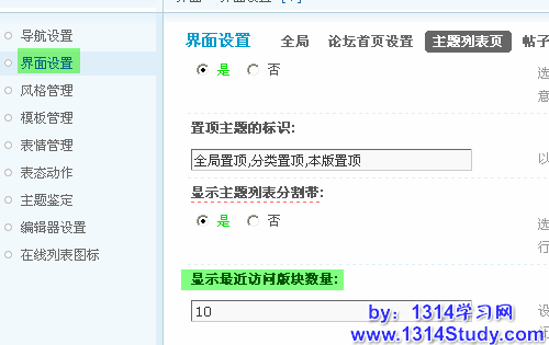 操作路径:【后台】=>【界面】=>【界面设置】=>【主题列表页】=>【显示最近访问版块数量】