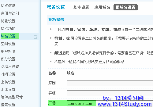 操作路径:【后台】=>【全局】=>【域名设置】=>【根域名设置】,在广场中设置根域名,如 comsenz.com