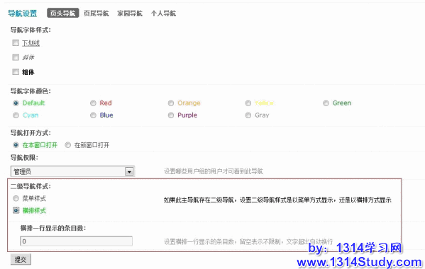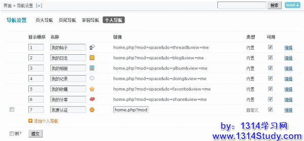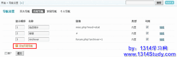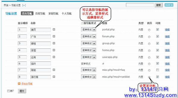 这里导航分为4种模式的:页头导航、页尾导航、家园导航、个人导航。