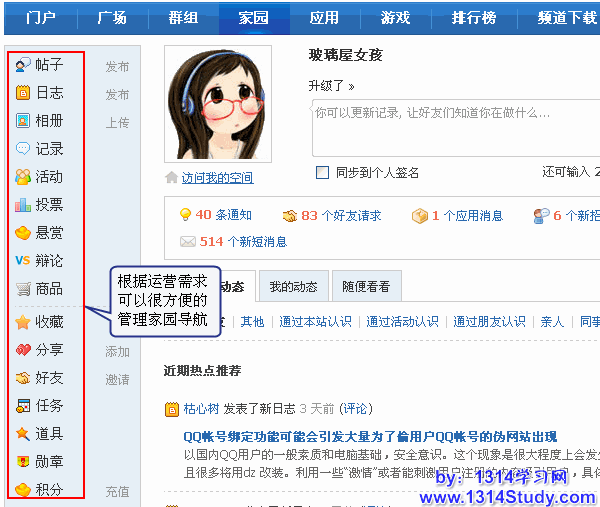 家园页面中的左侧菜单栏,在运营过程中大部分站长都有过或多或少的调整。现在好了,家园左侧的菜单栏也可以自定义了,我们可以根据运营的需求来随意调整家园导航项的展示。