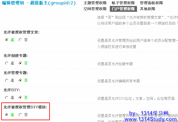 操作路径:【后台】=>【用户】=>【管理组】=>选择有该频道文章管理权限的用户组,点击“管理权限”=>“门户管理权限”允许被授权管理DIY模块,选择“是”