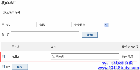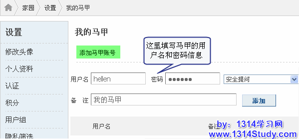 在 Discuz! X1.5 后台安装完“我的马甲”插件以后,点击启用,设置可使用该功能的用户组,即可在前台开启“马甲”操作。