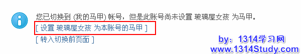 4、点击马甲账户名即可完成切换,这里备注一下,考虑到安全因素,Discuz! 的马甲切换不会产生自动双向切换,因此第一次切换时会提示“设置***为本账号的马甲的”,选择该项按照提示完成操作,即可在日后的管理中完成马甲账户的任意切换。