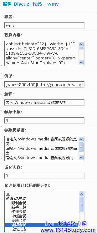 允许使用此代码的用户组:这是 Discuz! X1.5 新增加的选项,设置哪些用户组可以使用此代码。