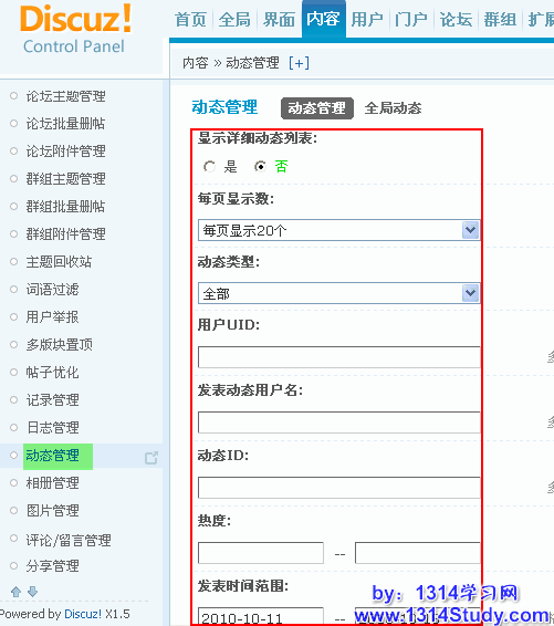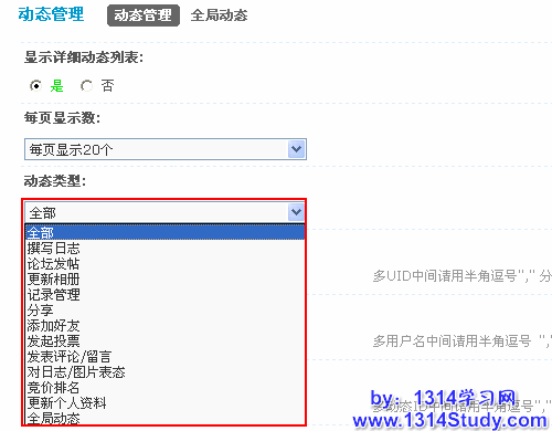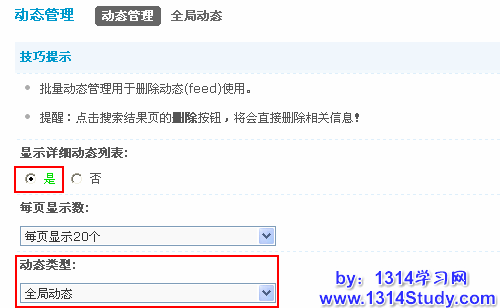 通过动态管理功能,站长可以方便的搜索和管理到站点动态,并且可以发表全局动态。