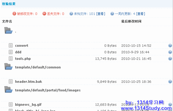 文件校验,这个功能可以让管理员即时发现站点程序是否被非法篡改。可以详细的了解到哪些文件被修改过,哪些文件是被增加的,哪些文件被删除了,一目了然。可以很快的从中发现问题、解决问题。