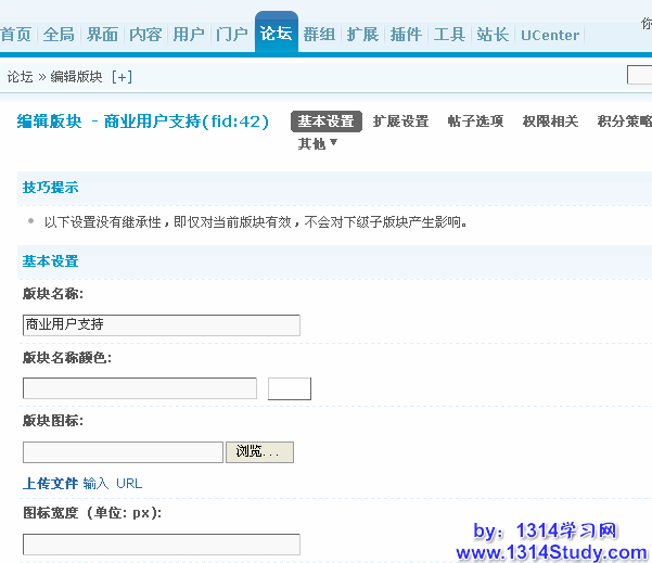 编辑版块的详细设置请查看:基本设置、扩展设置、帖子选项、权限相关、积分策略、其它。