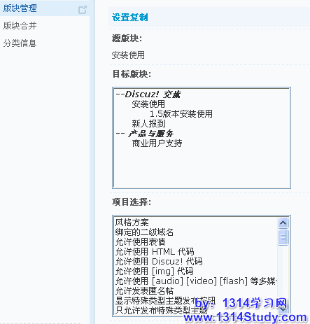 项目选择:选择要将源版块的哪些项目复制到目标版块,可以按住 CTRL 多选。