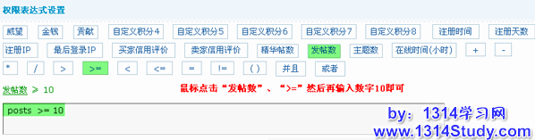 上图中的表达式代表:发帖数大于或者等于 10 的会员可以浏览该版权。