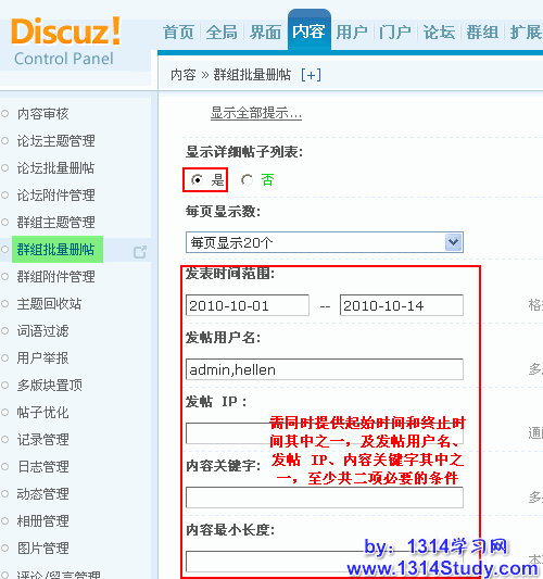 2、使用此功能,需同时提供起始时间和终止时间其中之一,及发帖用户名、发帖 IP、内容关键字其中之一,至少共二项必要的条件,否则将无法进行操作。