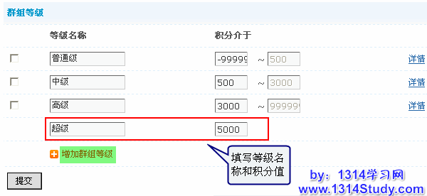 点击“增加群组等级”链接,填写等级名称,设置积分提交即可。