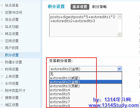 点击该页面右上角的“设置用户举报奖惩使用的积分”链接,我们可以看到“交易积分设置”在这里修改交易积分即可。