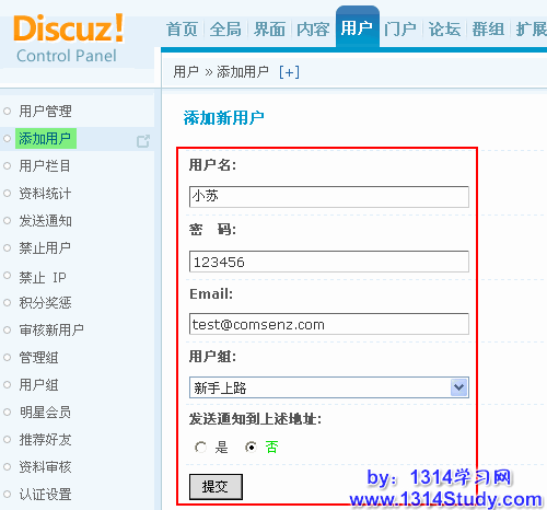 发送通知到上述地址:选择“是”,将发送通知到添加用户的 Email 中(在示例中如果选择“是”,通知邮件将会发送到 test@comsenz.com 这个邮件地址);