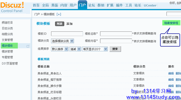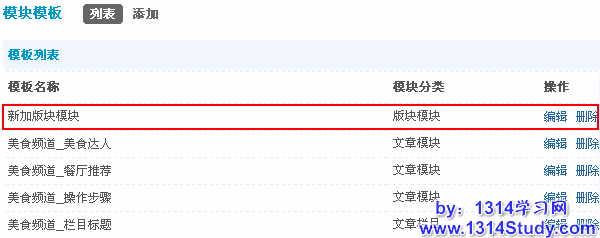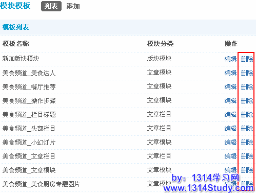 点击要删除的模块模板后面对应的删除链接,即可删除此模块模板,如下图所示: