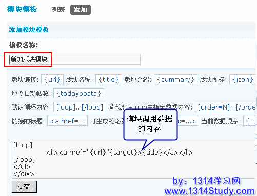2、再填写模板名称,在下图所示的文本框中输入模块调用的内容,点击提交即可,如下图所示: