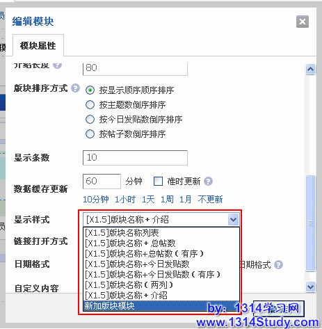 4、在前台 DIY 时,插入模块的时候,模块的显示样式下拉菜单中可以选择新增加的模板了,如下图所示: