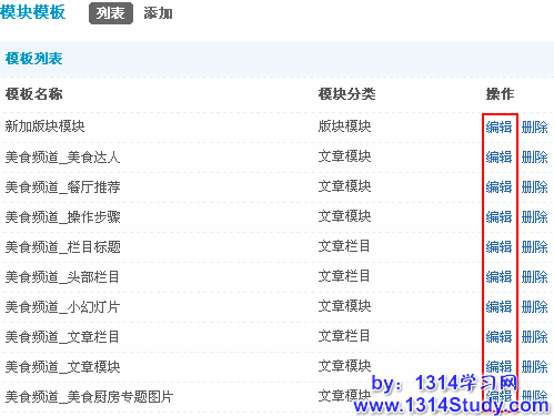 点击要修改的模块模板后面对应的编辑链接,修改模块模板名称或者模块数据调用内容,如下图所示: