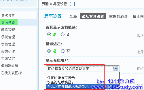 【后台】=>【界面】=>【界面设置】=>【论坛首页设置】,如下图所示: