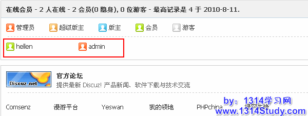 在线列表图标用于区分在线成员列表中会员的身份。当您打开在首页或分版块显示在线用户功能时,首页或分版块的在线会员列表中每个会员名称前都会显示其对应用户组图标。该功能使得查看在线会员的同时,还可以知道该会员所属的系统用户组。