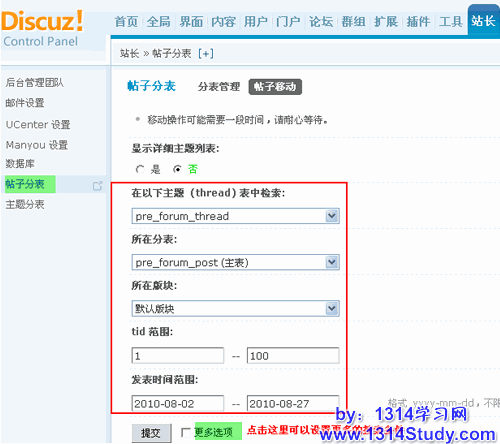 主表、副表、存档表中的数据可以互相移动,有点类似于帖子在版块中的移动。使用“帖子移动”功能可以在各个分表之间移动帖子。帖子移动涉及大量的数据转移,所以需要关闭论坛后使用。为防止数据库在移动过程中出现问题,请先进行数据备份。