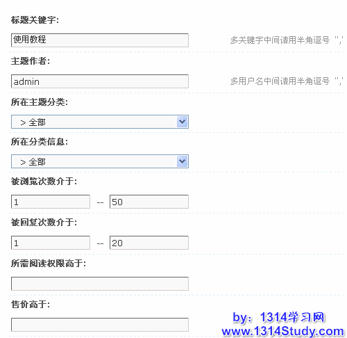 “在以下主题 (thread) 表中检索”会列出主题表存在的所有分表,指定其中一个主题分表,在其中进行搜索。“所在分表”会列出帖子表存在的所有分表,指定其中一个主题分表,在其中进行搜索。点击“更多选项”会出现更多搜索条件。