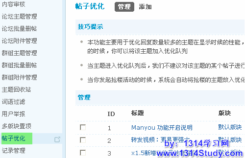 图中的列表表示已经加入优化的帖子列表,在此列表中可以了解到每个加入优化的帖子的ID、标题、所属版块、总回复数、发表日期。