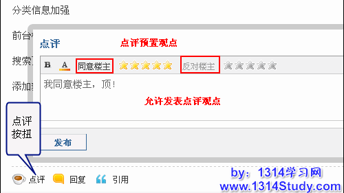 以普通主题点评预置观点为例:如果在这里设置了观点,会员在前台点评帖子的时候效果如下: