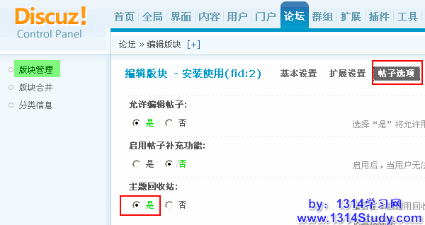 操作路径:【后台】=>【论坛】=>【版块管理】=> 编辑要开启主题回收站的版块 => 帖子选项中,就可以设置这个版块开启或者关闭主题回收站。
