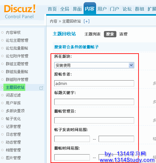 主题回收站中,可以根据不同的版块,作者,标题关键字,删帖管理员,帖子发表时间范围等条件进行搜索,并对搜索出来的帖子进行处理。