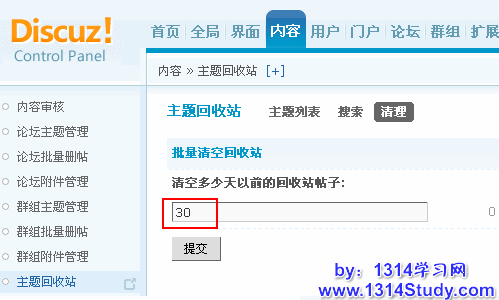 清理功能可以对回收站中删除时间超过了指定天数的帖子进行清空。避免回收站过大,占用太多数据库空间。
