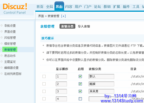 在论坛交流中,表情可以协助用户更加生动形象地表达自己。产品自带了3套表情,站长可以在后台启用或关闭某套表情。还可以导出、导入、自行添加或删除表情等,下面请看详细介绍。