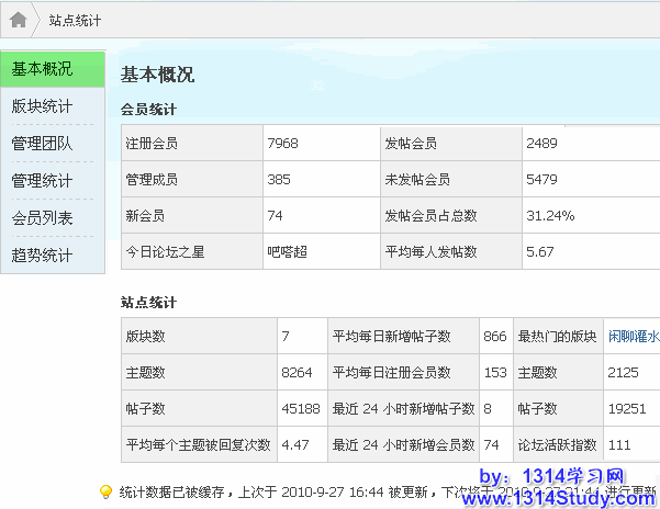 基本概况分为两个模块:会员统计和站点统计。通过会员统计,可以清楚知道会员的注册发帖情况,了解会员发帖积极性。通过站点统计,站长可以得知论坛的发帖情况、活跃指数以及最热门版块。
