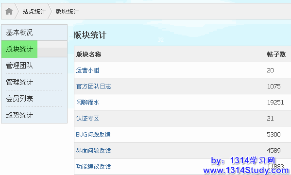 版块统计提供论坛各版块帖子数量。该功能旨在为站长分析热门版块提供数据,总结信息热点和站点活跃用户的喜好,从而提高论坛热度。