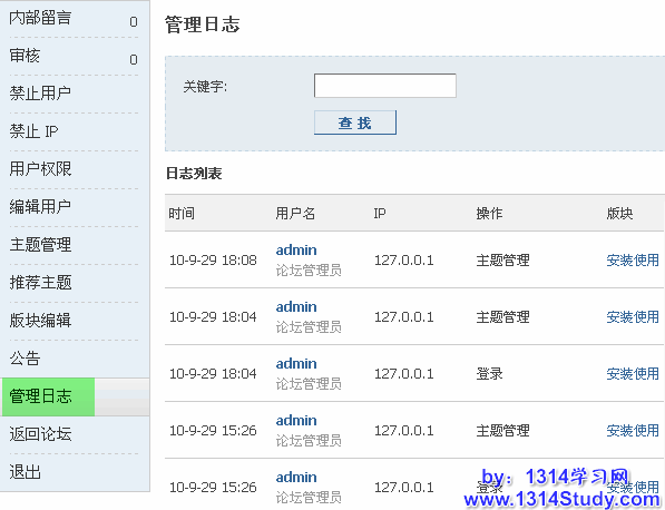 面对繁琐的论坛管理,站长很难不借助任何工具而统计出站点工作人员处理了哪些事务。Discuz! X1.5在前台就提供了论坛管理平台,站长登陆帖子列表页,点击“管理面板”即可进入,管理日志查看工作人员的管理情况,方便站长准确分析版主的工作效率。