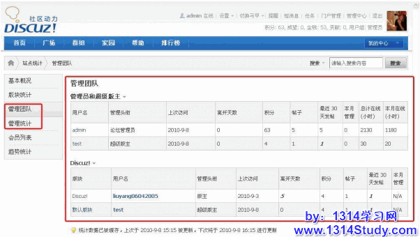 站长点击站点前端页面右下角的“站点统计”,也可完成对管理人员工作的考察。与论坛管理平台的管理团队统计功能不同的是,这里还提供了论坛管理团队,包括斑竹的活跃度数据,以表格的形式列出离开天数、积分、帖子总量、最近30天发帖量、本月管理次数、总计在线时长和本月在线时长等数据,为站长对论坛工作人员的绩效考评提供参考。站长可以根据版主的工作情况,奖优罚劣,鼓励那些表现良好的版主,对于不能行使版主职能、完成版主工作的,给予剔除。