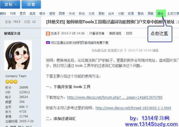 所谓帖子模块推送就是把某个帖子推送到某个指定的模块下进行显示,如把某个比较热门的帖子放在今日推荐的模块里并在门户首页显示,同时也可以让帖子生成文章,即将某个比较重要或者回复率较高的帖子生成门户文章放在指定的频道下进行独立显示。通过主题管理下的模块推送功能,就能轻松推送社区精华。
