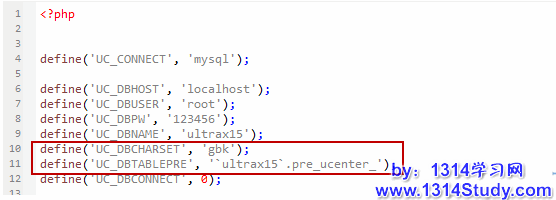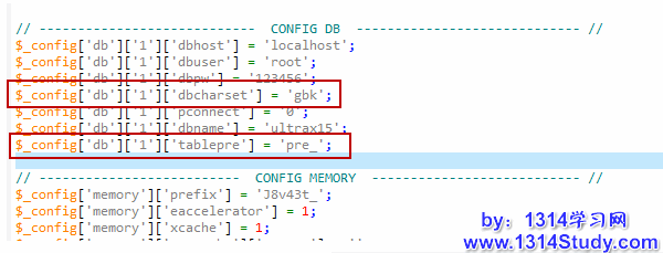 下面把对应转到的编码的版本程序覆盖原来的程序(比如我这里就是用 utf8 版本的程序来覆盖下),之后需要我们手动的修改一下 config/config_global.php 和 config_ucenter.php 文件中的如图中标识的地方。