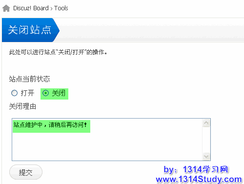 tools 会自动检测出站点的当前状态,比如当前状态为关闭,可以在这里直接选择打开,站点即可打开。如果当前状态站点为打开,可以在这里关闭站点,并填写关闭理由。