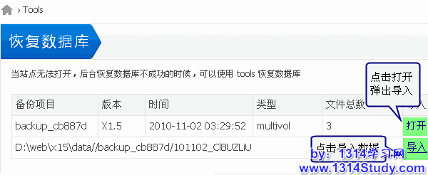 当站点无法打开,后台恢复数据库不成功的时候,可以使用 tools 恢复数据库。
