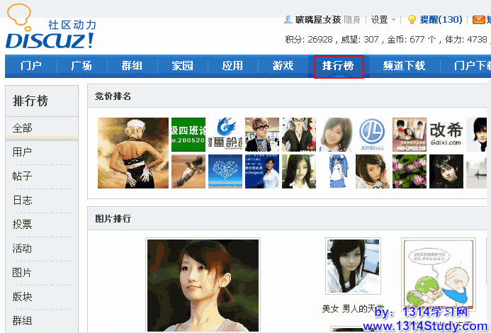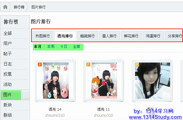 3、图片排行榜的美女吸引眼球。“美女”永远是最吸引眼球和最好的社区推广方法之一,站长可以在社区内多放一些美女图片,借此吸引会员眼球和点击。
