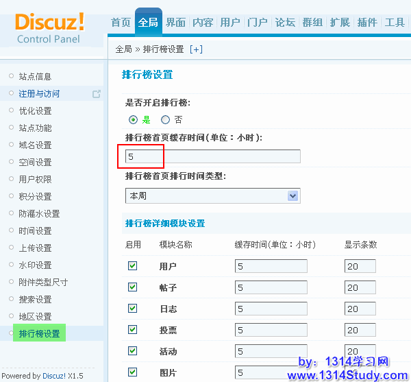 通过这里来设置排行榜的相关指数。因为排行榜调用的是全站数据,会占用比较多的资源,因此建议站长根据自己站点的情况来灵活设置排行榜的缓存时间。一般来说,小型社区,内容较少的情况下可以设置缓存时间为1~3个小时;而针对一些内容量较多的大型地方社区,则建议设置3~5个小时。如下图所示: